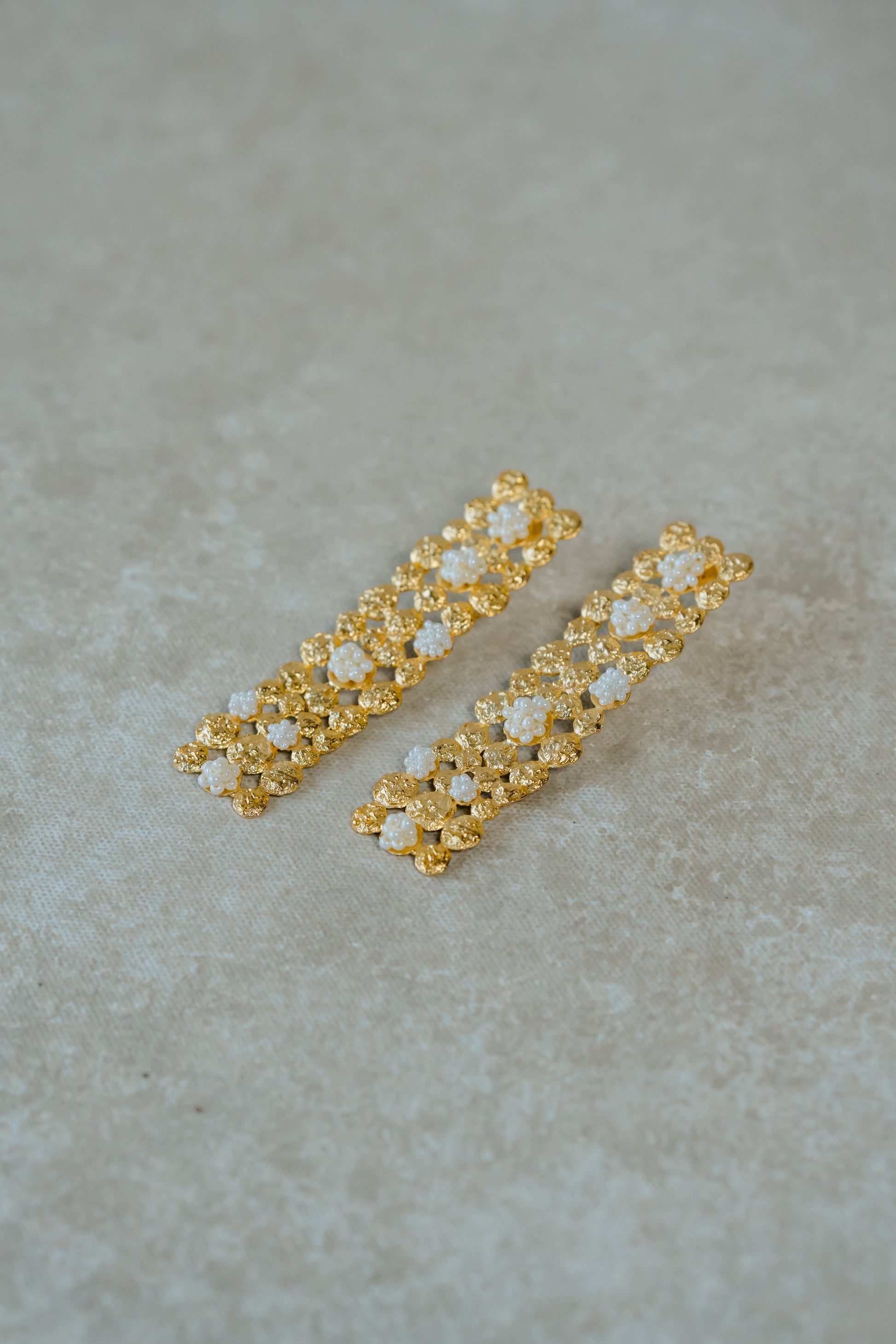 A statement pair of earrings hand crafted by carefully placing little pieces of moon side by side.